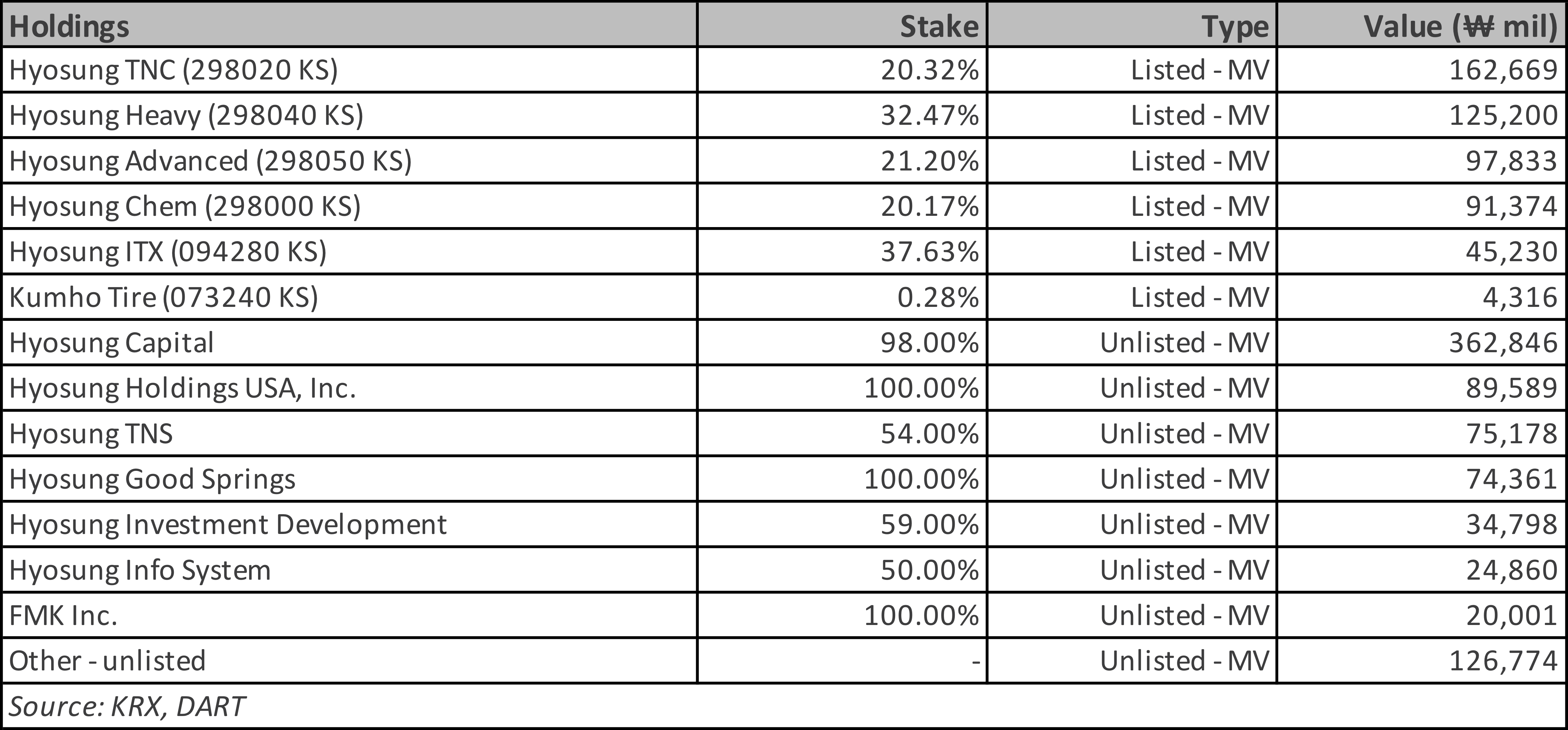 - Hyosung Corporation (004800 KS) had fallen 16% just in two days. Holdco is now at a 50% discount to NAV. This is a 10%p drop from 10 days ago (Dec 19). Holdco price must have been overly corrected. The ongoing police investigation on Cho Hyun-joon’s alleged crime won’t lead to a delisting. 10%p drop in discount to NAV must be a price divergence, not a sensible price correction.