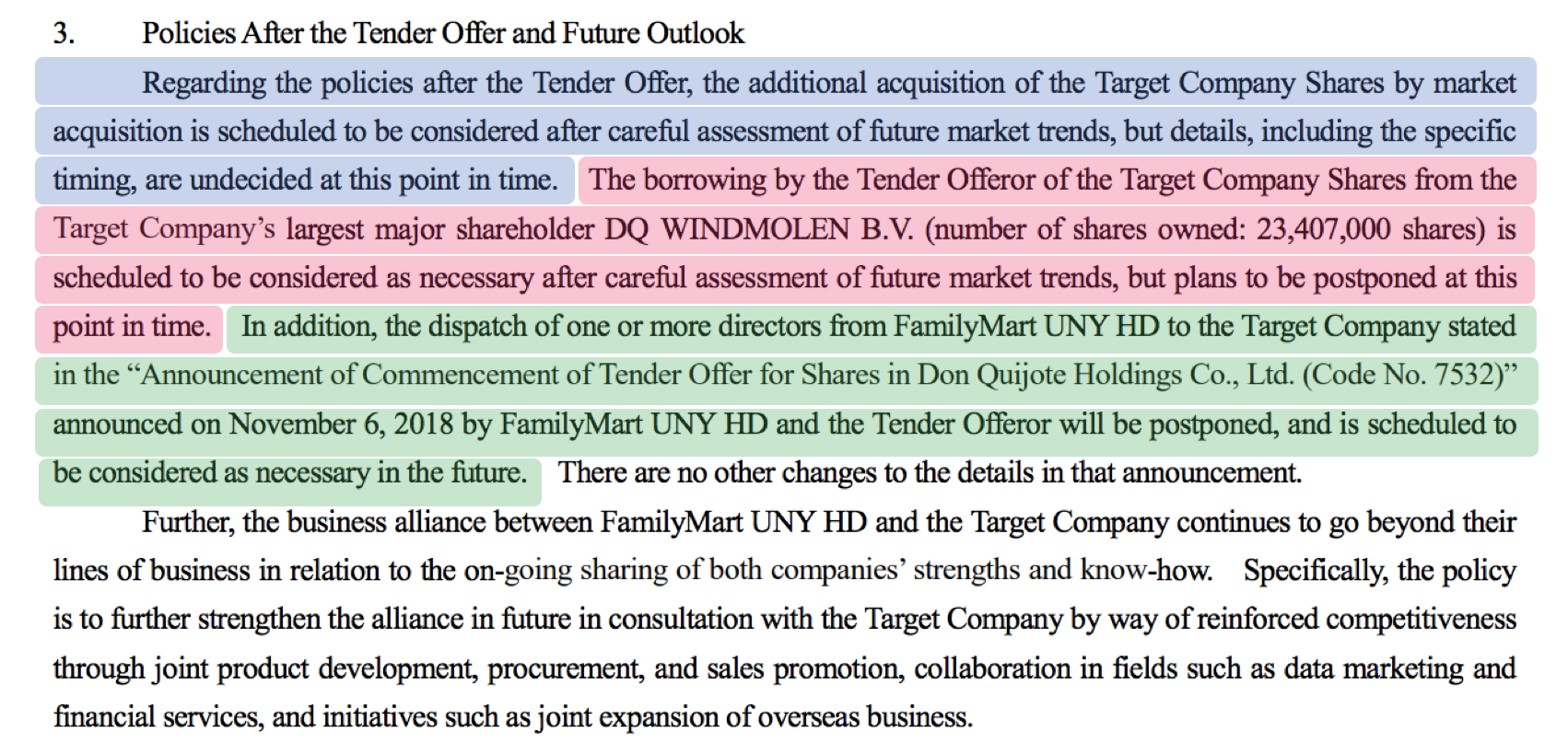 Recapping the original plan: when Familymart Uny Holdings (8028 JP)(“FM”) sold the remaining 60% of UNY to Don Quijote Holdings (7532 JP) (DQ), it entered into an agreement to buy 20+% in DQ, for one of two reasons; 1) a company wants to prove to the employees of a division being sold that they are maintaining a watchful eye over them, or (as is now evident) 2) the buyer wants to gain an equity method affiliate and the income from it (including the placeholder for frontrunner status to future capital events).