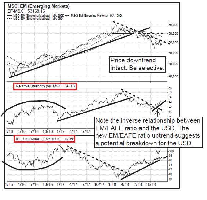 Relative strength for MSCI EM is bottoming vs. MSCI EAFE despite continued global equity market weakness. Although the MSCI EM’s price index remains in a downtrend, we are seeing signs of outperformance ona a relative strength basis and would add incremental exposure. In this report we highlight attractive and actionable themes within EM.