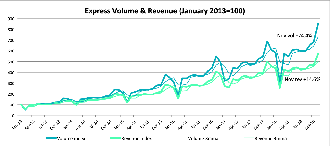 Express parcel revenue growth dipped below 15% last month. Weak per-parcel pricing pulled express sector Y/Y revenue growth down to just 14.6% in November, the worst on record (again excluding distorted Lunar New Year comparisons). Chinese e-commerce demand has slowed and we suspect ‘O2O’ initiatives, under which online purchases are fulfilled via local stores, are also undermining express demand growth.