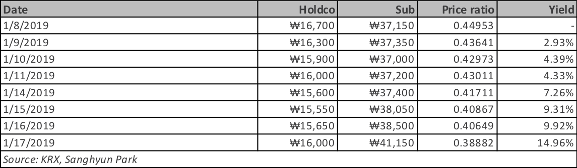Importantly, this is the first time that price ratio is hitting below -2σ since late September last year. We should expect another quick mean reversion at this level. Just, this time it will be the other way. I’d go long Holdco and go short Sub now.