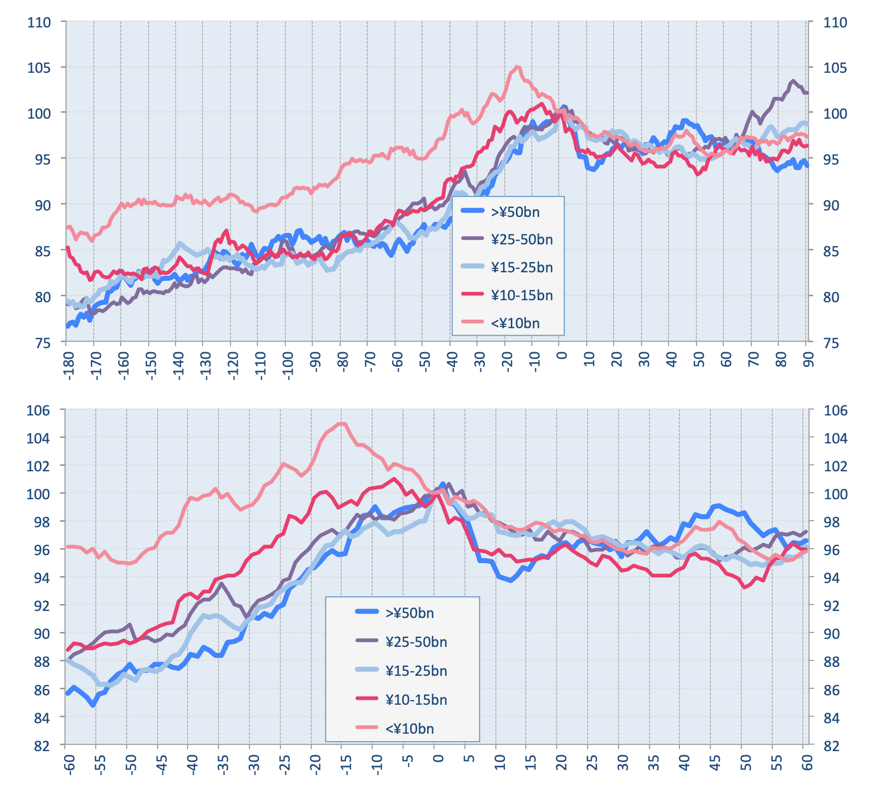 The announcements for TOPIX and JPX Nikkei 400 were made then, and despite the events being entirely similar in construct, but different in month of Scheme Effective Date, they were put in the same month for Mitula and the first tranche of the Takeda inclusion, which was split between two months because of its large impact.