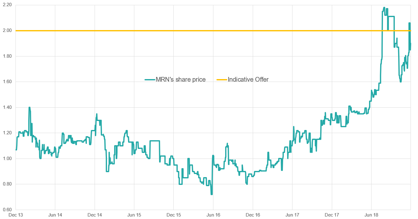 - MRN was trading between A$1.20 and A$1.60 during the first half of the year. Following the announcement of the Nine-Fairfax merger in July, the share price reached a high of A$2.18. While the expected offer price of A$2.00 is 8.3% lower than this lifetime high, it is still 26% higher than the stock’s undisturbed price of A$1.59 before the Nine-Fairfax merger deal was announced.