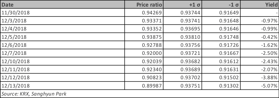 (link to Sanghyun’s insight: HDC Holdings Holdco Trade: Status Update & Recommended Action) - The BGF Co Ltd (027410 KS) / Bgf Retail (282330 KS) price ratio is at a new yearly low. The Holdco discount now stands at 48.55% to NAV. There is now an estimated 1.5~2% difference in dividend yield.