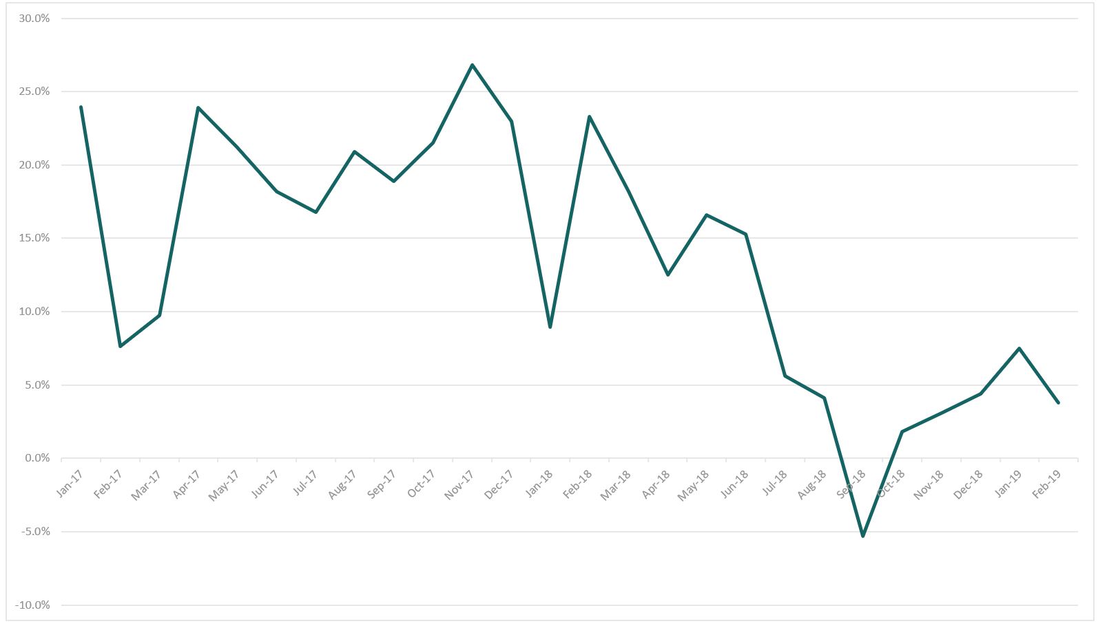 In the year to December 2018, operating profit was up only 2.1% on a 7.0% increase in sales, largely due to an increase in machine vision marketing expenses. In January and February 2019, factory automation orders and sales dropped abruptly as customers sought to reduce excess inventories. In March, some new orders were received for delivery in May, indicating that the situation may stabilize in 2H. Demand for security and automatic door sensors continues to grow at low single-digit rates.