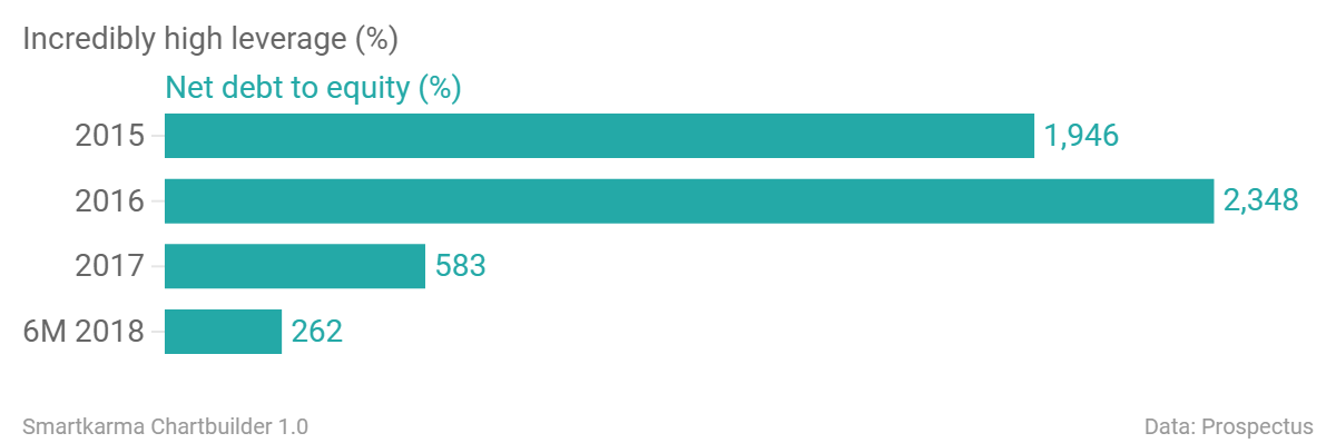 It was highly leveraged in FY2016 as it ramped up its expansion efforts but had been able to reduce it significantly to about 260% net debt to equity levels while effective interest rates on debt has been falling every year.