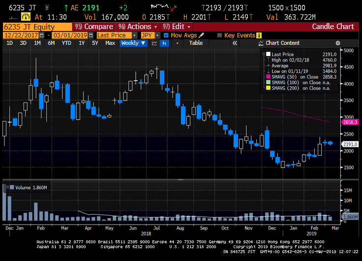 - Sumco has posted an extraordinary loss following the early termination of a long-term polysilicon purchasing agreement. The long-term contract with Osaka Titanium is expected to end in March 2019. We expect this move to help Sumco switch to cheaper polysilicon which in turn should help reduce costs. That being said, some of the long-term contracts for polysilicon are still continuing, and there is still significant inventory built-up so this impact could take four to five years to be fully realised.