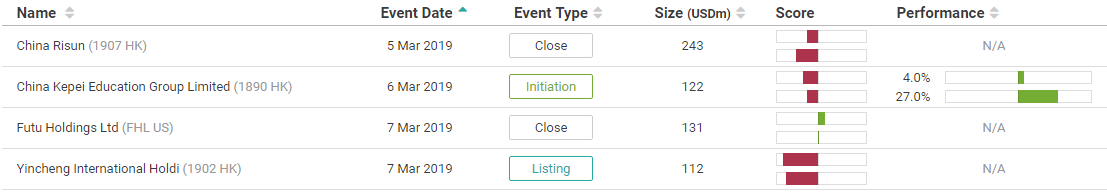Below is a snippet of our IPO tool showing upcoming events for the next week. The IPO tool is designed to provide readers with timely information on all IPO related events (Book open/closing, listing, initiation, lock-up expiry, etc) for all the deals that we have worked on. You can access the tool here or through the tools menu.