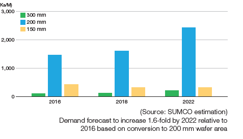 - The semiconductor silicon wafer market saw continued growth in demand for all wafer diameters supported by applications for servers, data centers, automobiles and IoT applications.