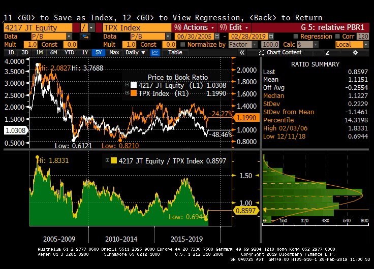 It is seeing decent organic growth, led by a focus on third party logistics (3PL). This will carry on. The recently acquired Ricoh Logistics should eventually see margins improve as it is integrated into SBS. This year’s operating profit forecast of Y9bn (+10%) is conservative. An increase of Y1bn this year will come from Ricoh Logistics alone, and then we have organic growth. In our view operating profit will be at least Y10bn. There is the unrealised profit on land, which add some Y85bn to a company whose market cap is Y71bn. Despite the outperformance over the last 12 months, this remains a decent long-term domestic buy, and one in which foreigners still own only 12%. The shares trade on 13x 12/19 assuming an operating profit of Y10bn.