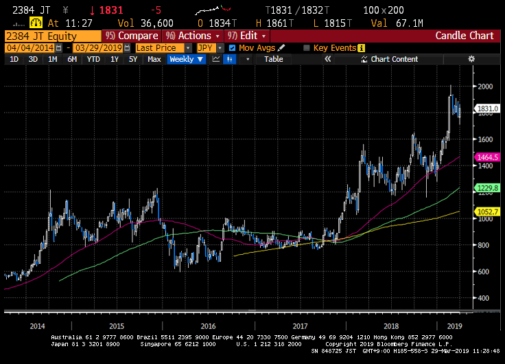 It is seeing decent organic growth, led by a focus on third party logistics (3PL). This will carry on. The recently acquired Ricoh Logistics should eventually see margins improve as it is integrated into SBS. This year’s operating profit forecast of Y9bn (+10%) is conservative. An increase of Y1bn this year will come from Ricoh Logistics alone, and then we have organic growth. In our view operating profit will be at least Y10bn. There is the unrealised profit on land, which add some Y85bn to a company whose market cap is Y71bn. Despite the outperformance over the last 12 months, this remains a decent long-term domestic buy, and one in which foreigners still own only 12%. The shares trade on 13x 12/19 assuming an operating profit of Y10bn.