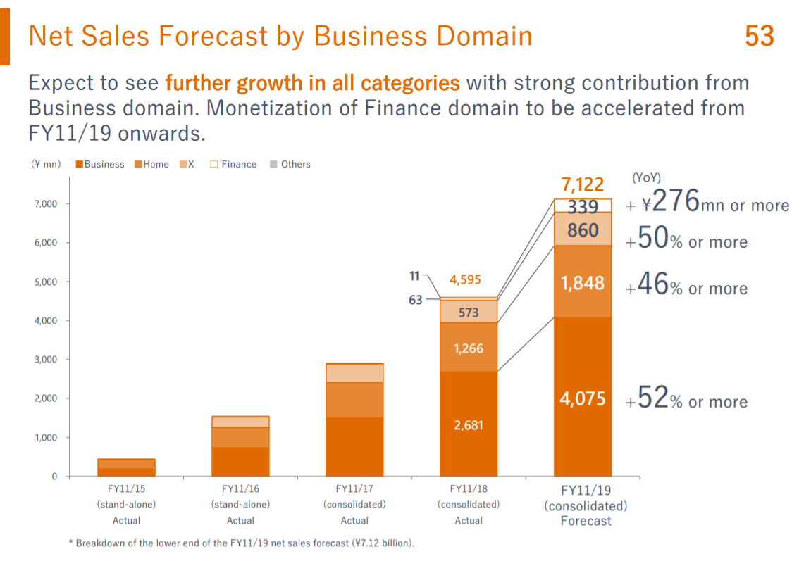 Since then, Money Forward’s share price has picked up (closing at JPY4,400 on 26th March 2019), on the back of strong topline guidance for FY11/19E (+55%-65% YoY growth) and “aggressive” medium-term profit targets (positive EBITDA by FY11/21E).