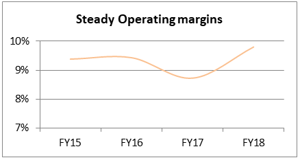 - Despite large B2B exposure, company managed to defend gross margins over FY15-18 by passing on input cost variations to its customers. Operating margins have also been steady on the back of improving margins in the key wires and cables segment.