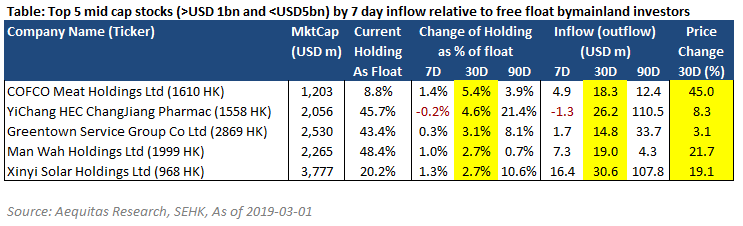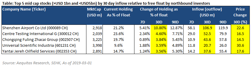 We note that offshore investors were buying all GICS sectors, and had a strong preference for Industrials, Consumer Staples, Consumer Discretionary, and Financials names. We estimate that total inflow into the A-share market via northbound trade amounted to USD 8.4 bn in February.