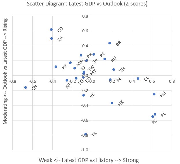 - Introducing the “EM-25” Growth Profile Framework: This data-driven, automated and standardized model generates a ranking of the “EM-25” economies based on a composite of factors reflecting: 1/ The most recent GDP growth data (in relation to three look-back periods), 2/ Forward-looking consensus growth forecasts (in relation to the most recent four quarters of GDP) and 3/ Upgrades and downgrades to those forecasts.