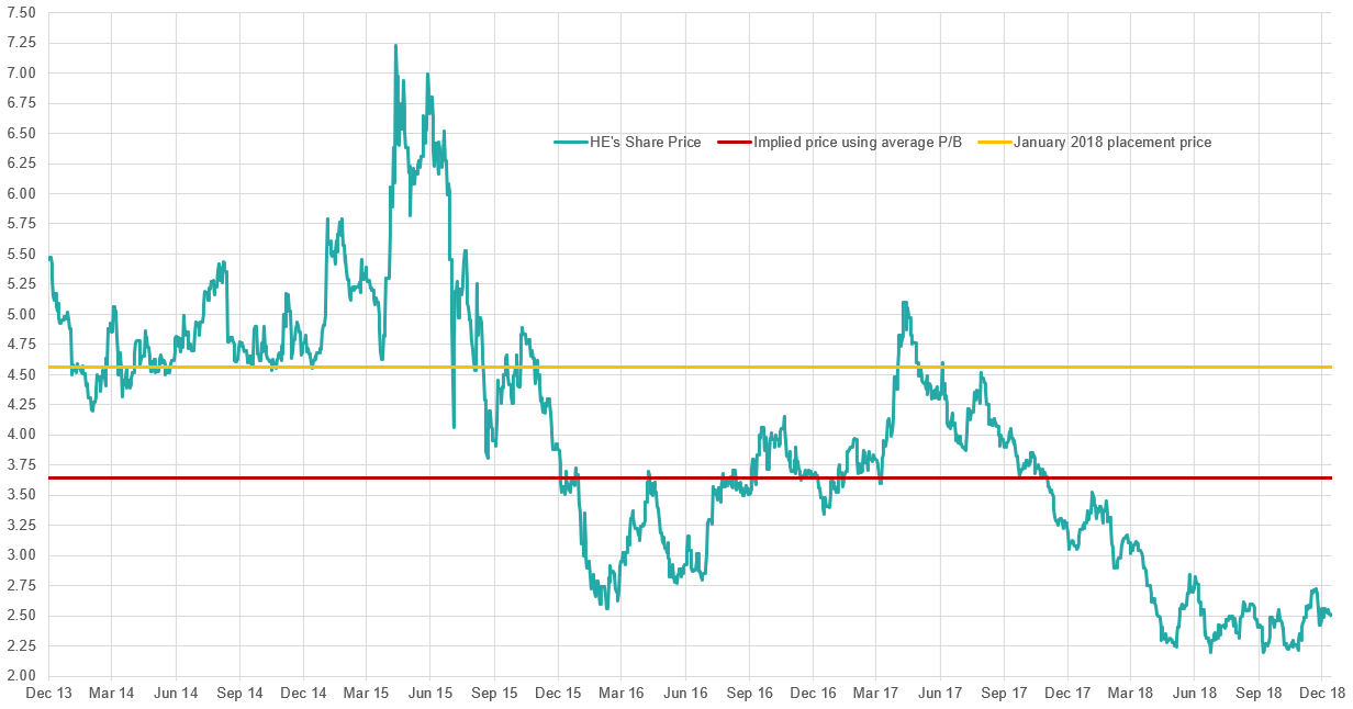 HE has perennially traded at discount to net cash. As at its last traded price, the discount to net cash (using the 2018 interim figure of HK$12.4bn or HK$7.27/share) was 65%.