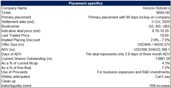 - Horizon Robotics (9660 HK) raised around US$800m in its Oct’24 IPO and another US$600m via a placement in June’25. It’s back again to raise another US$834m via a top-up placement.
