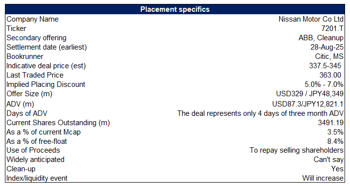 - The deal is a large one to digest, representing 33.1 days of the stock’s three month ADV, and 0.7% of total shares outstanding.