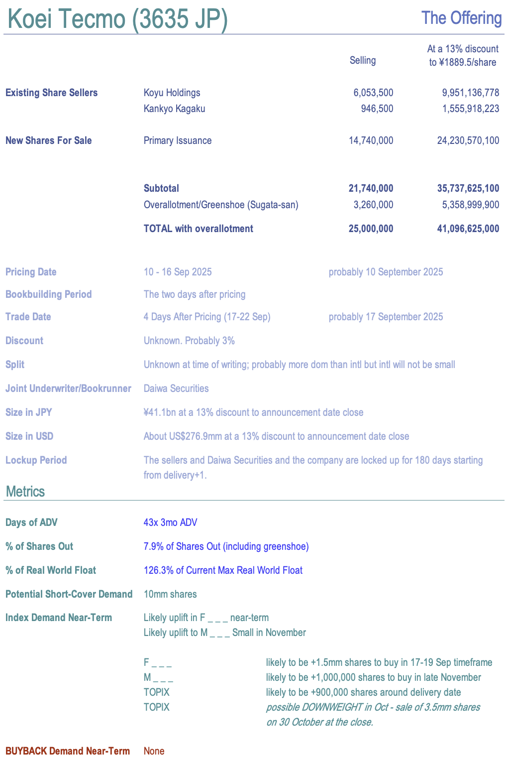 1. [Japan ECM] Koei Tecmo (3635 JP) Needs to Sell Shares To Stay in Prime ($280mm Offering)