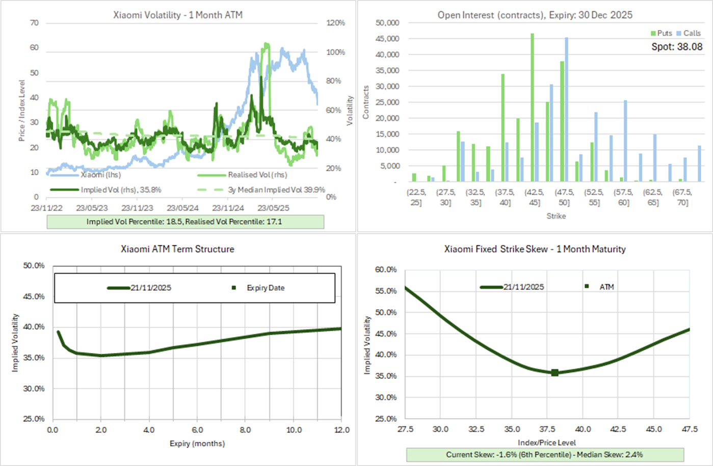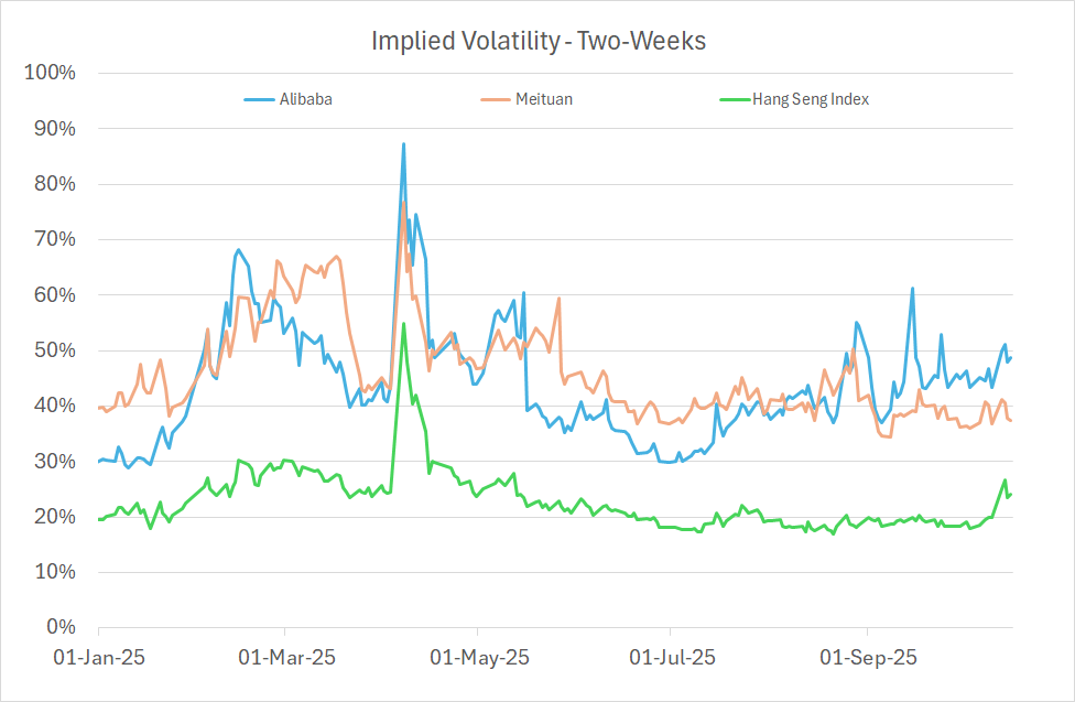 - Highlights: In contrast, Alibaba’s IV remains rich, while Hang Seng Index IV is cheap across the curve, offering attractive hedge entry points.