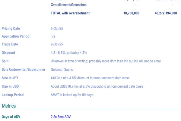 - The underwritten placement alone is a large one for the stock to digest at 168 days of three month ADV.