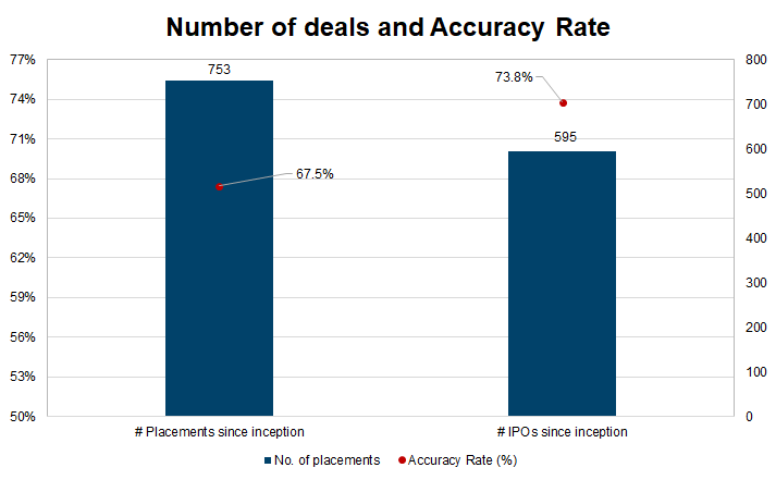 Our overall accuracy rate is 73.8% for IPOs and 67.5% for Placements