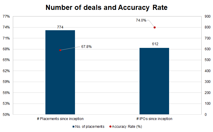 Our overall accuracy rate is 74% for IPOs and 67.8% for Placements