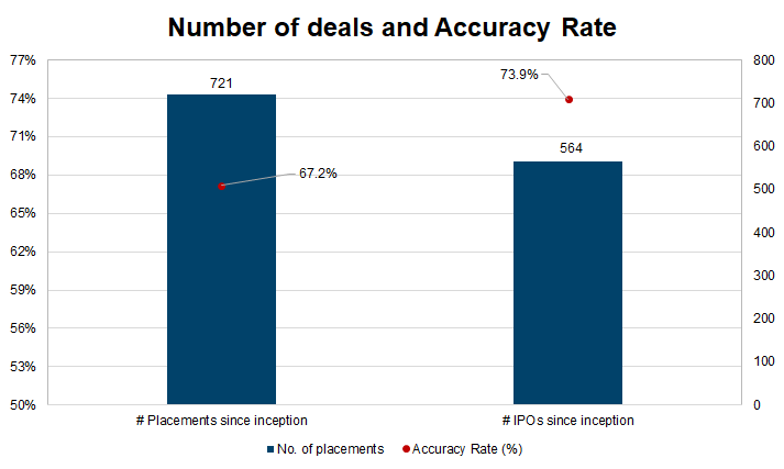 Our overall accuracy rate is 74% for IPOs and 67.2% for Placements