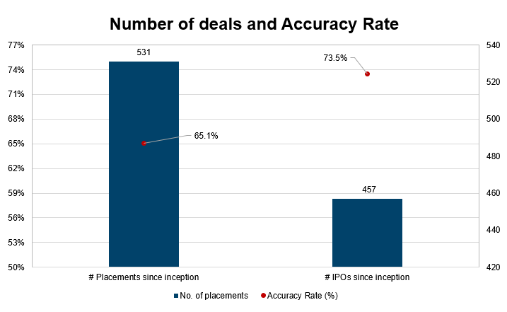 Our overall accuracy rate is 73.5% for IPOs and 65.1% for Placements