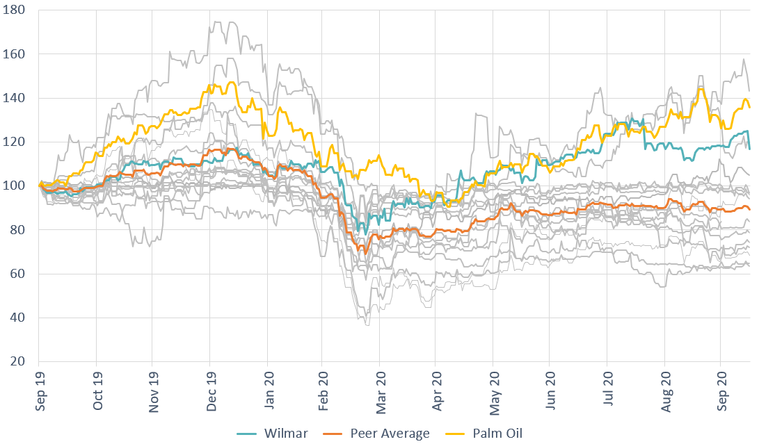 Source: CapIQ. CPO, Wilmar, plantation peers and the average in Base 100 from a year ago.