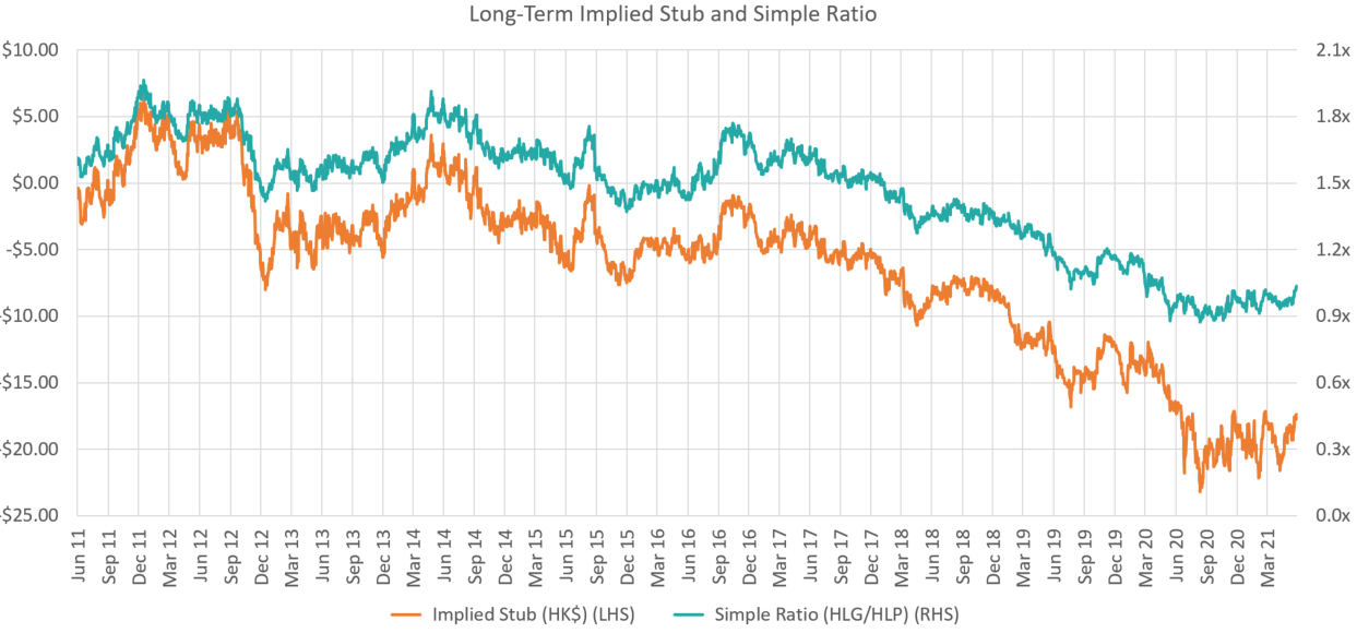 I estimate the discount to NAV at ~56% versus its 12-month average of 59%. Both the long-term stub and the simple ratio (HLG/HLP) remain at around decade-lows, although off recent lows in the middle of last year.