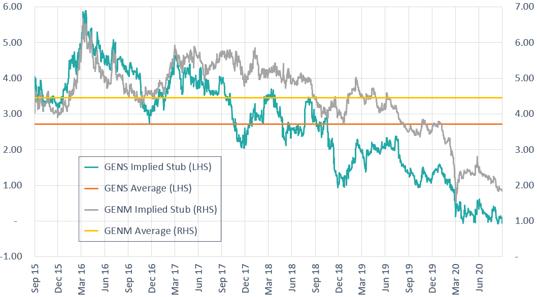 I estimated Genting was trading at a ~56% discount to NAV, its 12-month low and +2STD against a one-year average of ~46%. The implied stubs for GENS and GENM (simply netting of each separately) are both at multi-year lows. Stripping out the holding in GENS, the implied stub is now at the same negative level it has (modestly) rebounded off five times since March. GENT continued to underperform even after GENM announced it will subscribe for up to US$150mn of preferred stock in 49%-held Empire Reports, which operates a casino resort outside of New York.
